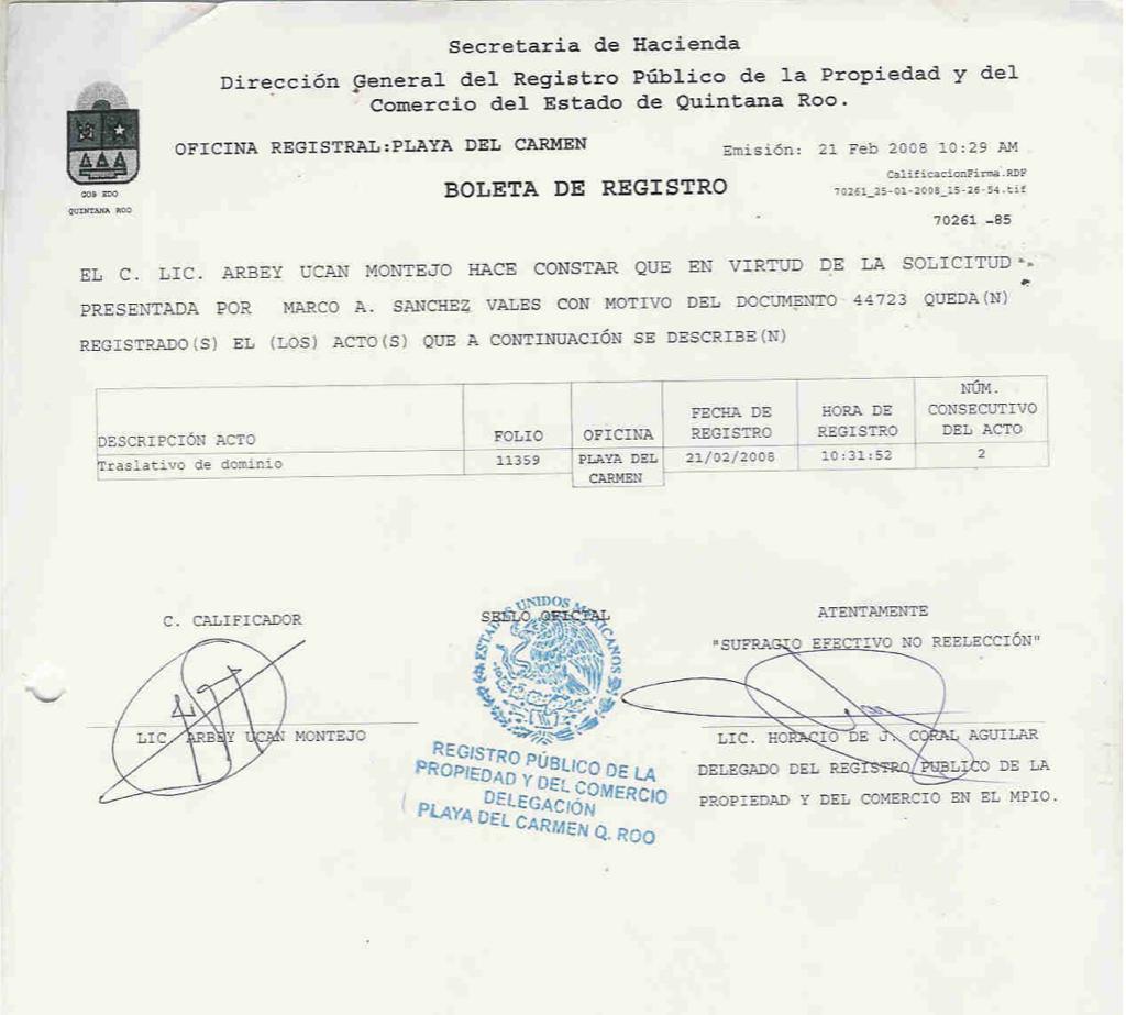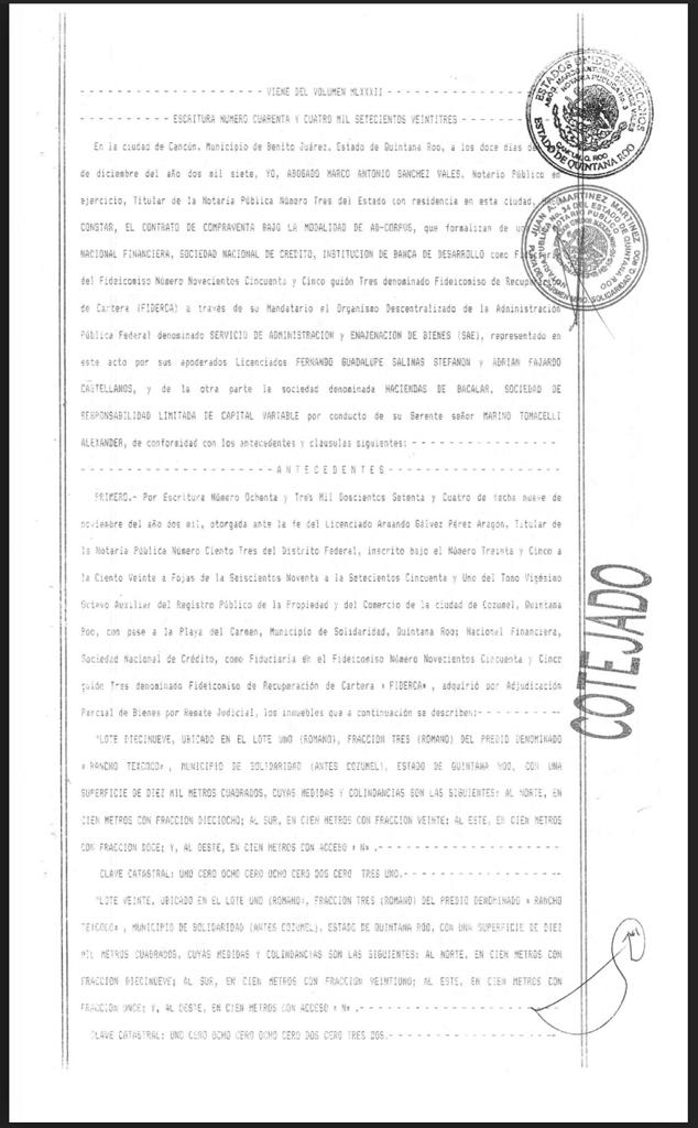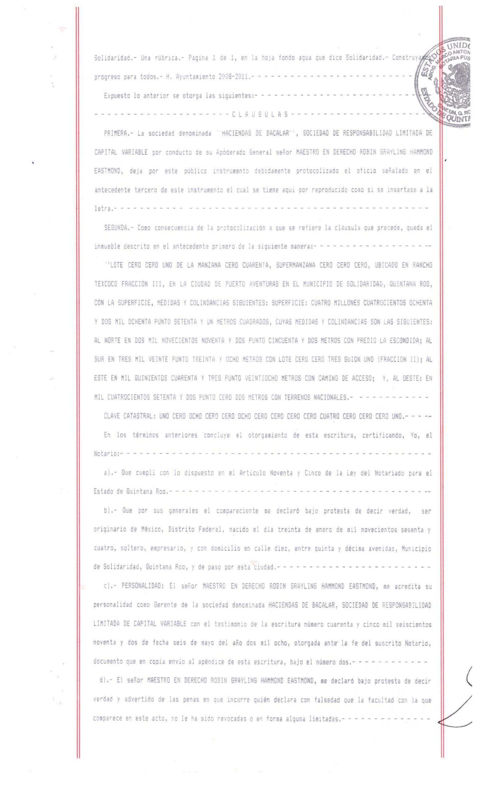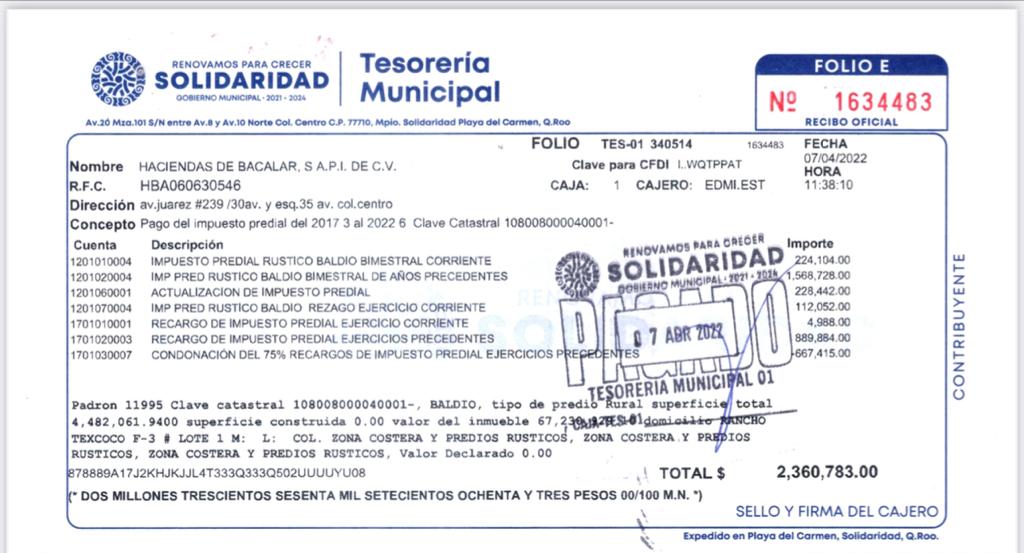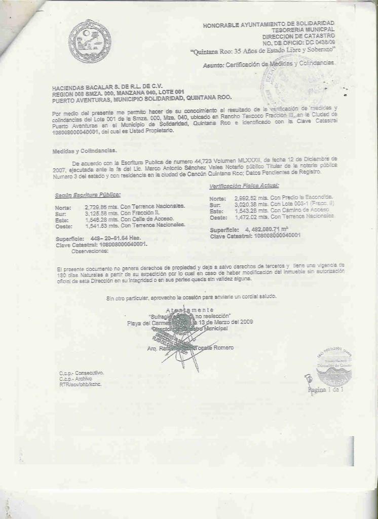 The municipal cadastral office of Solidaridad has certified and notarized the measurements and boundaries of the Rancho Santa Selva Parcel and property taxes are paid through December 2023.